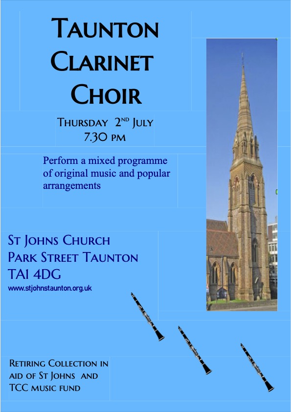 Taunton Clarinet Choir (TCC) which was formed about 5years ago present their first public concert in Taunton. The 14 members play a range of clarinets --from the bass up to… Read More »Taunton Clarinet Choir