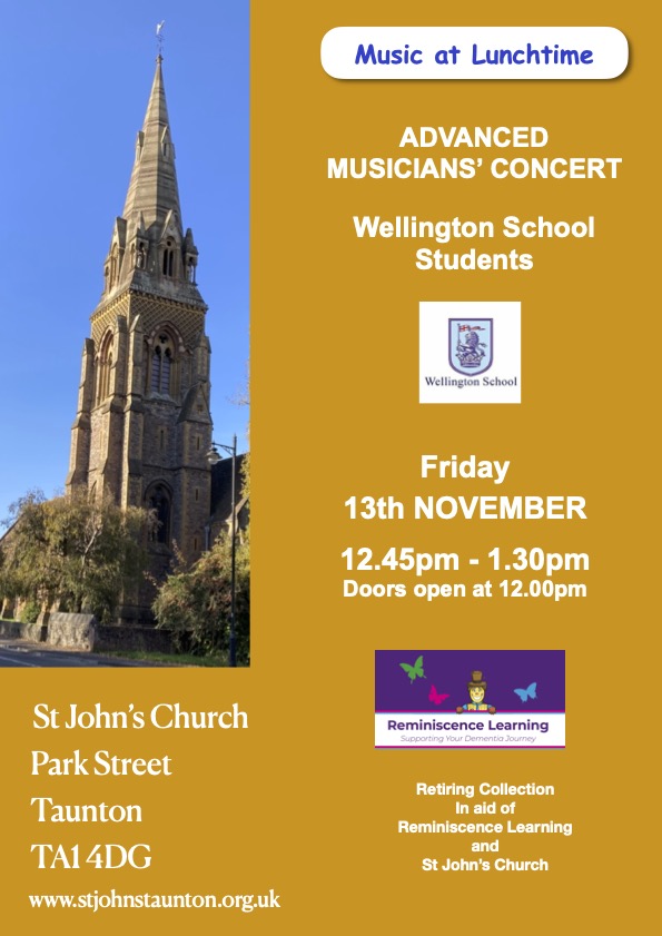 Wellington School Students A group of talented, award holding students will perform music with a wide variety of stages and styles. Retiring collection in aid of Reminiscence Learning, a Local… Read More »Lunchtime Concert – Advanced Musicians’ Concert