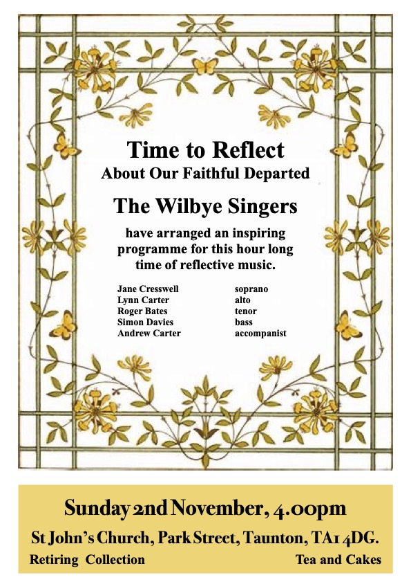 The Wilbye Singers have arranged an inspiring programme for this hour long time of reflective music. Jane Cresswell - soprano, Lynn Carter - alto, Roger Bates - tenor, Simon Davies - bass, Andrew Carter - accompanist. There will be a retiring collection to help defray the cost of hosting the event. Tea and homemade cakes… Read More »Time to Reflect About the Faithful Departed
